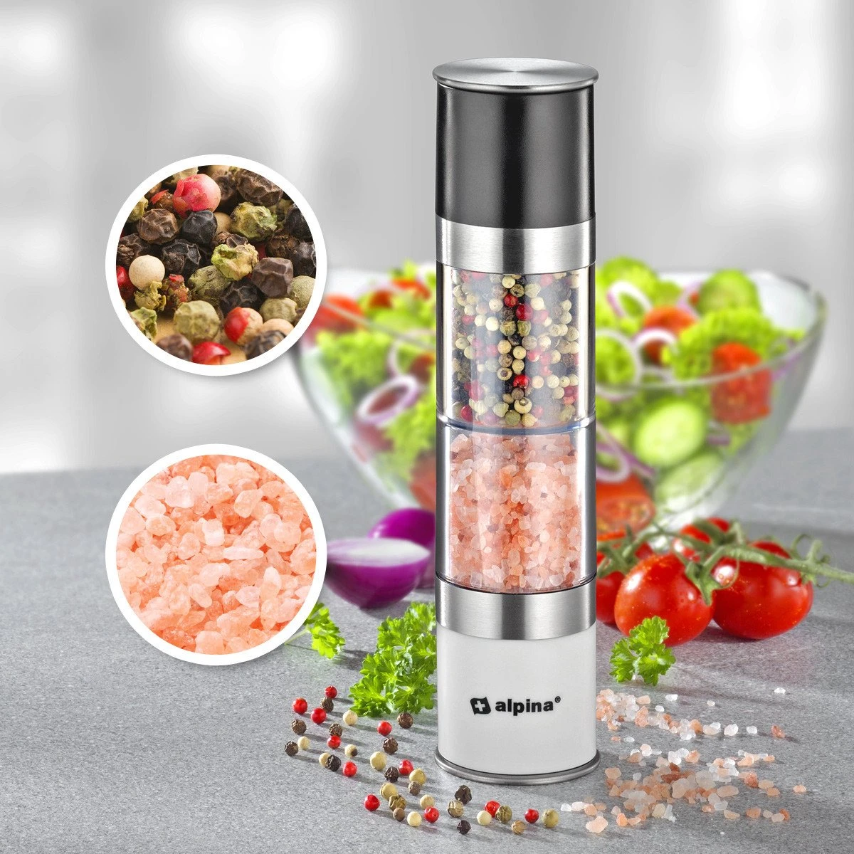 De alpina zout- en pepermolen is gemaakt van robuust kunststof en roestvrijstaal. Hij ligt stevig in de hand en heeft een vlijmscherp maalmechanisme waarmee je in een handomdraai peper- en zoutkorrels fijn maalt. Hij ziet er zo mooi uit dat je hem ook gewoon op tafel kunt zetten, zodat iedereen zelf zijn eten op smaak kan brengen. Met zijn minimalistische moderne uiterlijk past hij bij elke stijl.