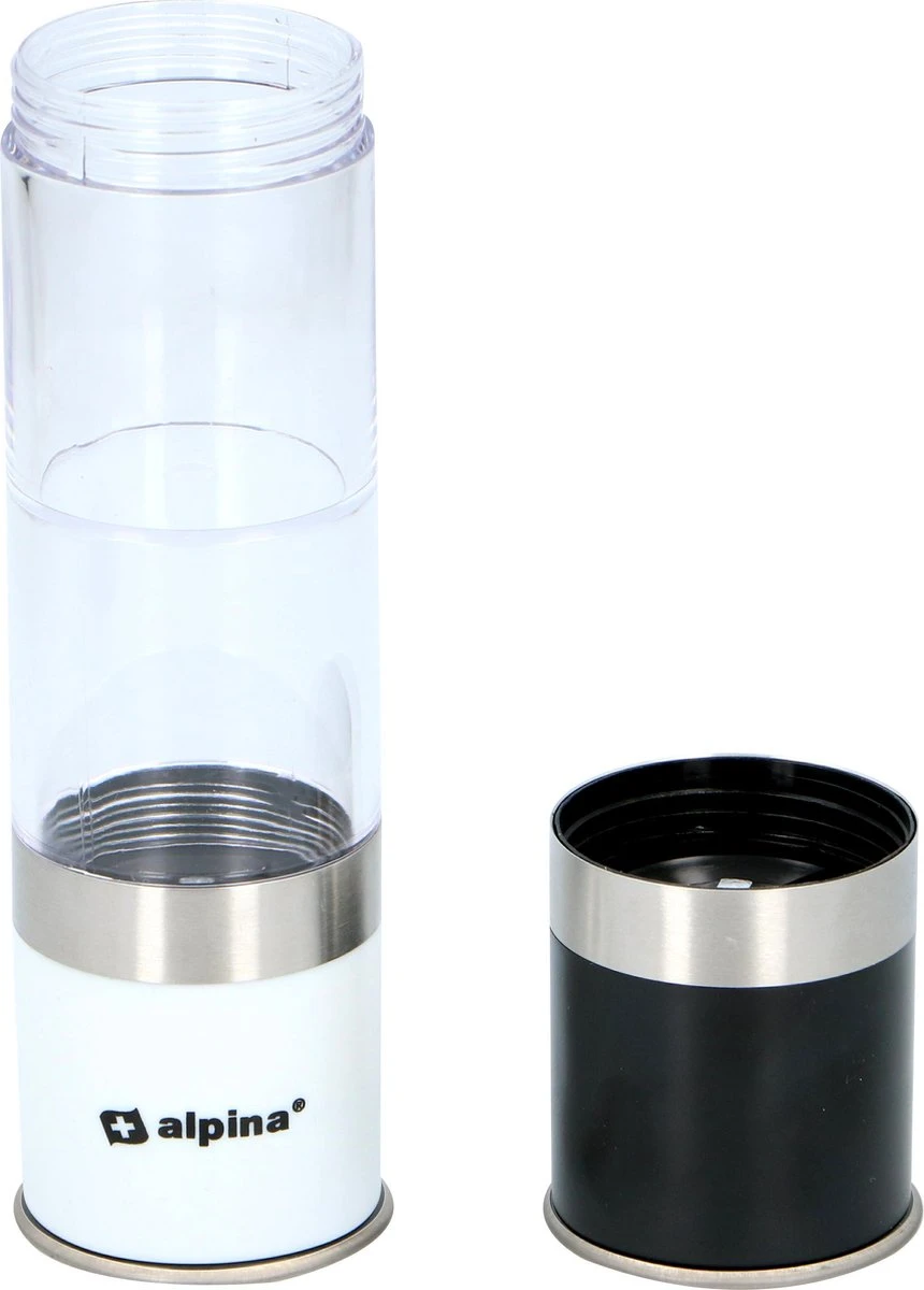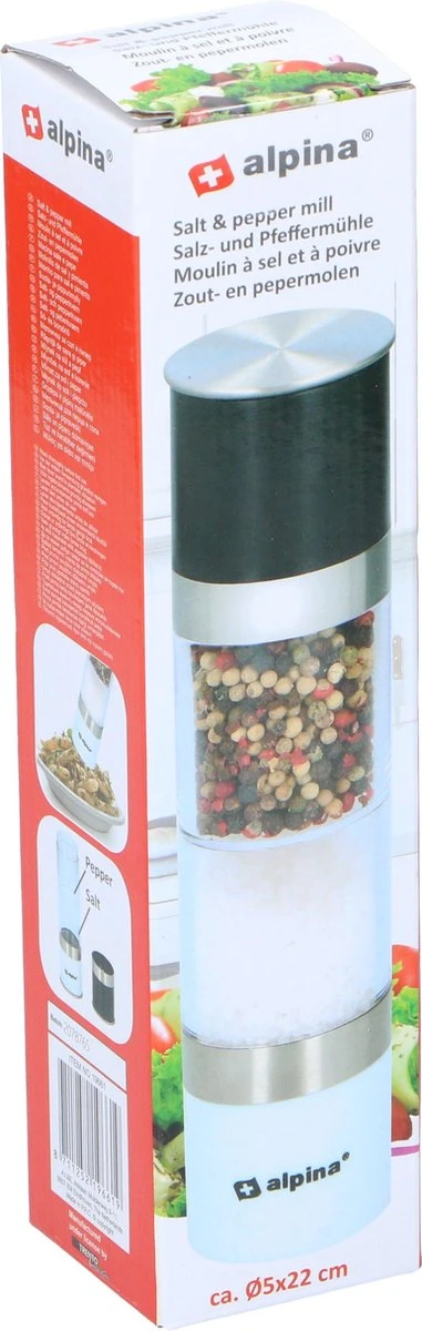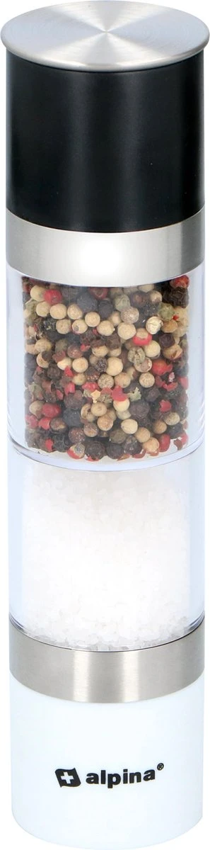 Deze mooie peper- en zoutmolen van alpina mag in geen enkele keuken ontbreken. Hij is zwart/wit en transparant en heeft roestvrijstalen accenten. Dat maakt hem erg fraai voor zowel op het aanrecht als op tafel. Hij doet wat hij belooft: peperkorrels en grof zout fijn malen om je gerechten heerlijk op smaak te brengen. Aan de ene kant maalt hij peperkorrels en aan de andere zijde grof zeezout. Aan beide kanten zit een afsluitdekseltje, zodat er geen peper en zout uit kan vallen als je hem niet gebruikt.