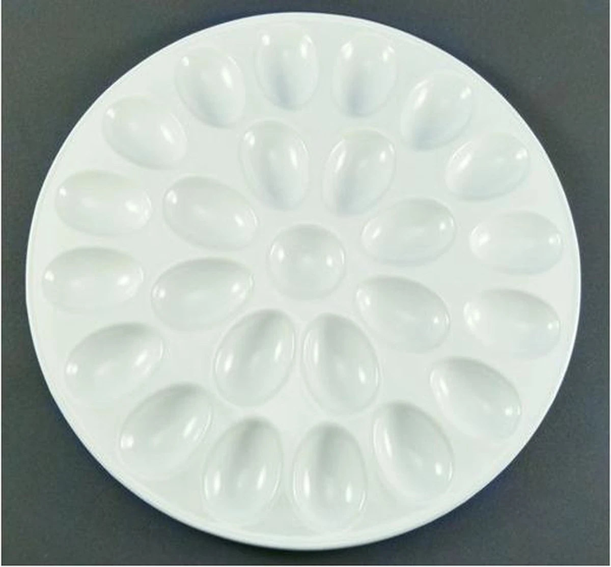 Op deze aardewerken schaal passen 25 eieren. U kunt hier uw verse eieren op bewaren maar ook prachtig gevude eieren op serveren.