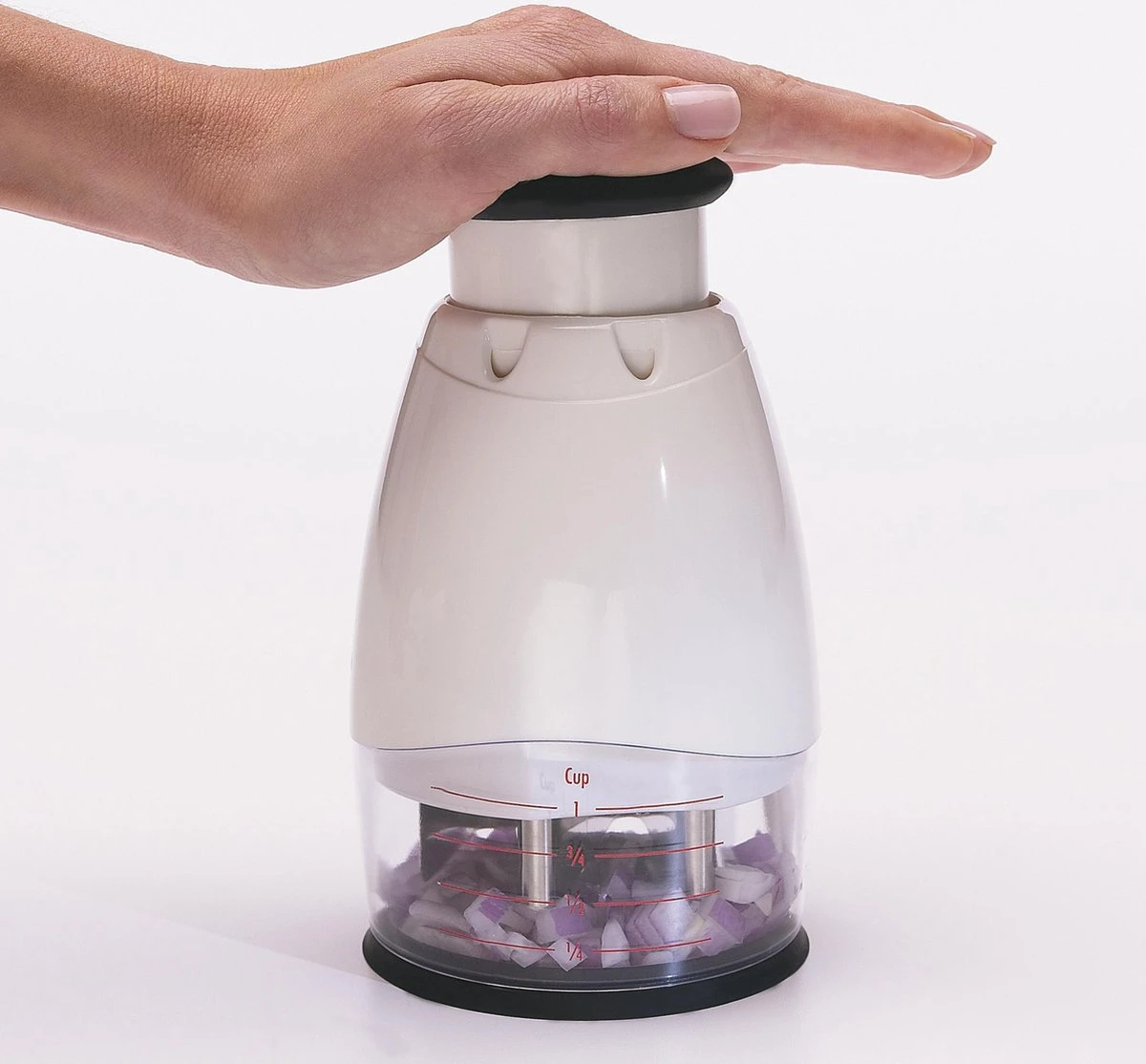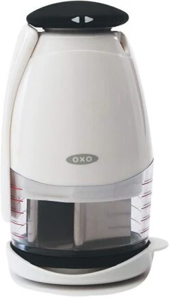 Maak het hakken van uien, noten en nog veel meer makkelijk met de OXO Good Grips Groentehakker. Druk op de knop en de messen draaien rond voor een gelijkmatig resultaat. Een interne zachte bumper absorbeert elke schok voor extra comfort. Hak ingrediënten in de bijgeleverde maatbeker met zijn zachte, anti-slip basis, of verwijder de voet en hak ze direct op een snijplank. Een schraper roteert in de maatbeker en voorkomt ophoping aan de zijwanden. Het gehele hakmes kan eenvoudig worden losgeschroefd, waardoor schoonmaken een eitje is. De Groentehakker is voorzien van een lepel, dus je handen hoeven nooit meer naar uien of knoflook te ruiken.•Perfect voor het hakken van knoflook, sjalotten en noten