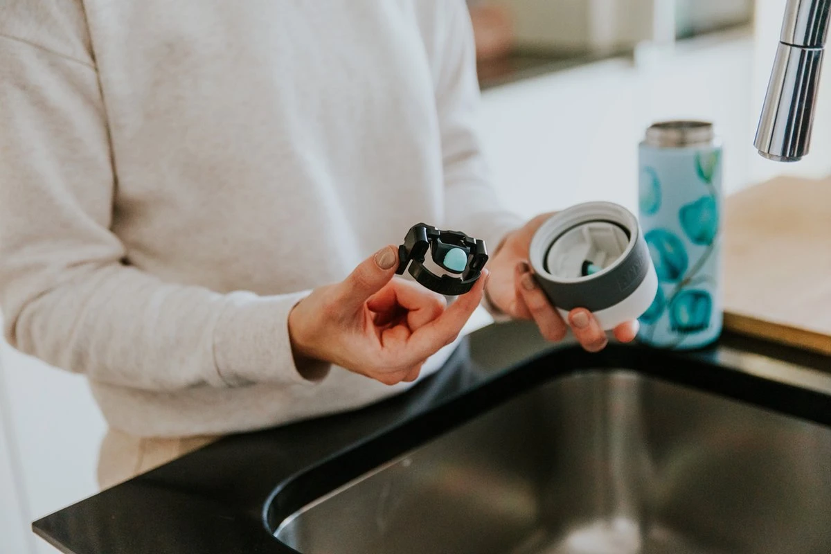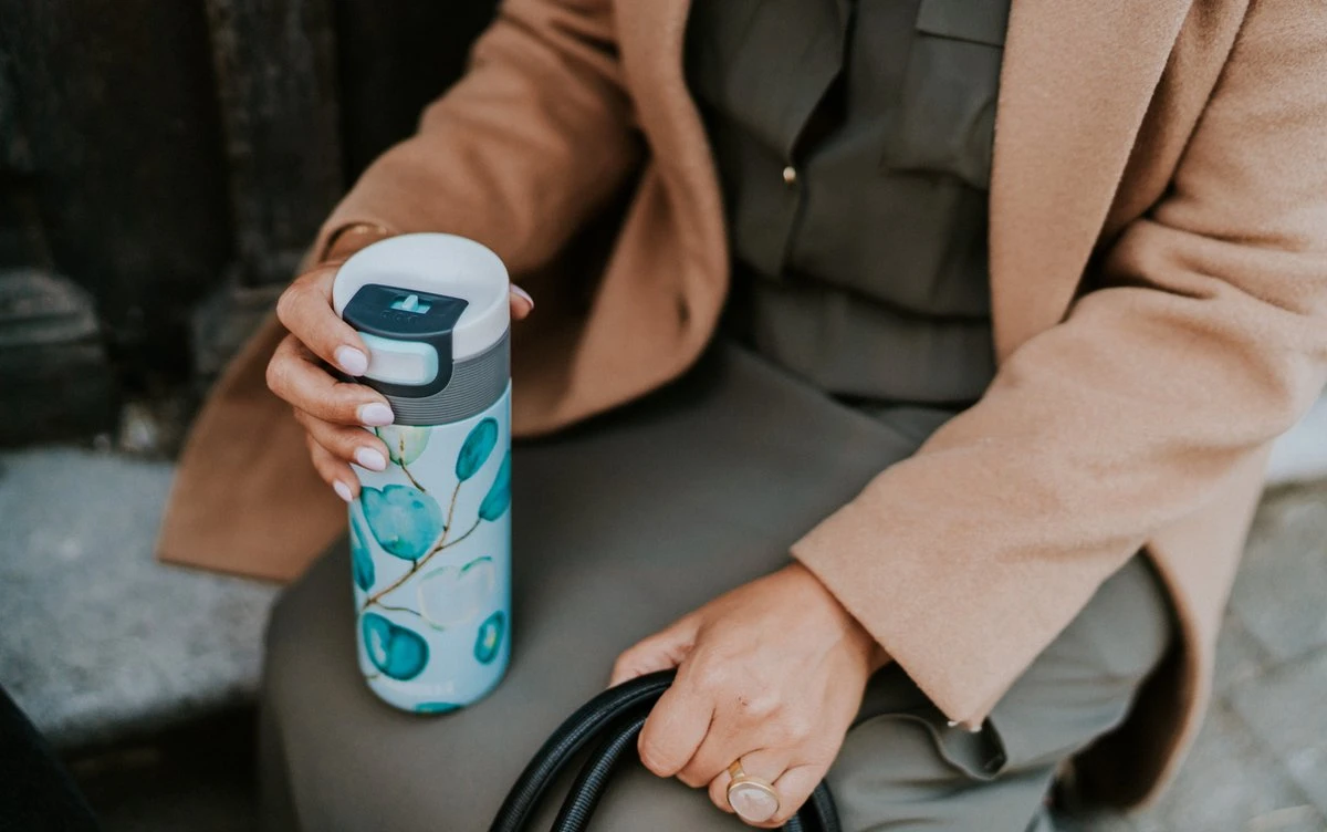 1: Druk’-positie: druk op de knop van onze thermosbeker om een slok te nemen. Nooit meer morsen terwijl je haast naar de volgende meeting of al rennend je trein probeert te halen.