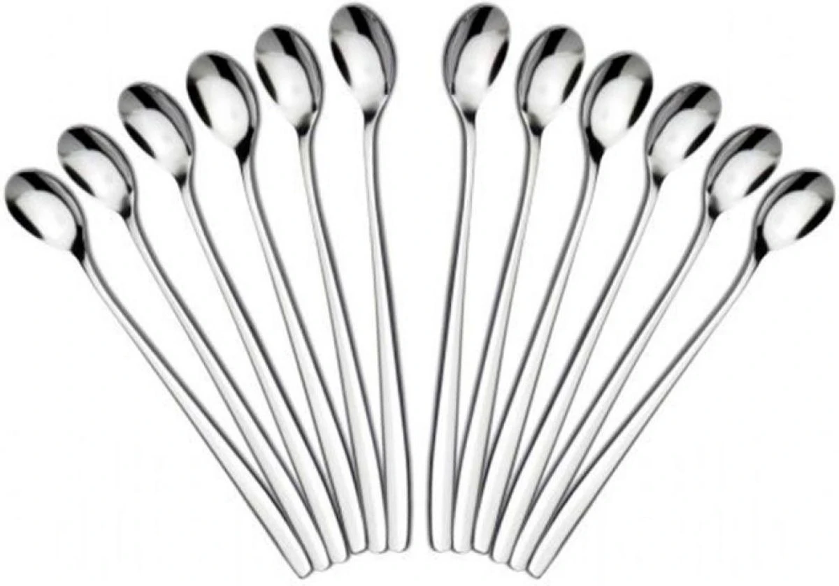 Set van 12 roestvrijstalen Latte Macchiato lepeltjes. Handig om in lange glazen te roeren of uit te scheppen.