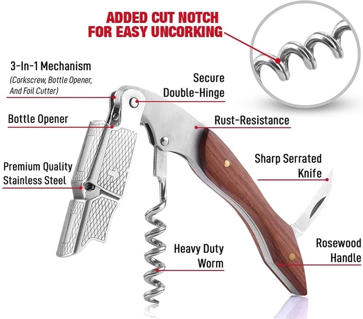 Vervaardigd uit sterk roestvrij staal gecombineerd met duurzaam hout is deze kelnerskurkentrekker gemaakt met de bedoeling om lang mee te gaan.