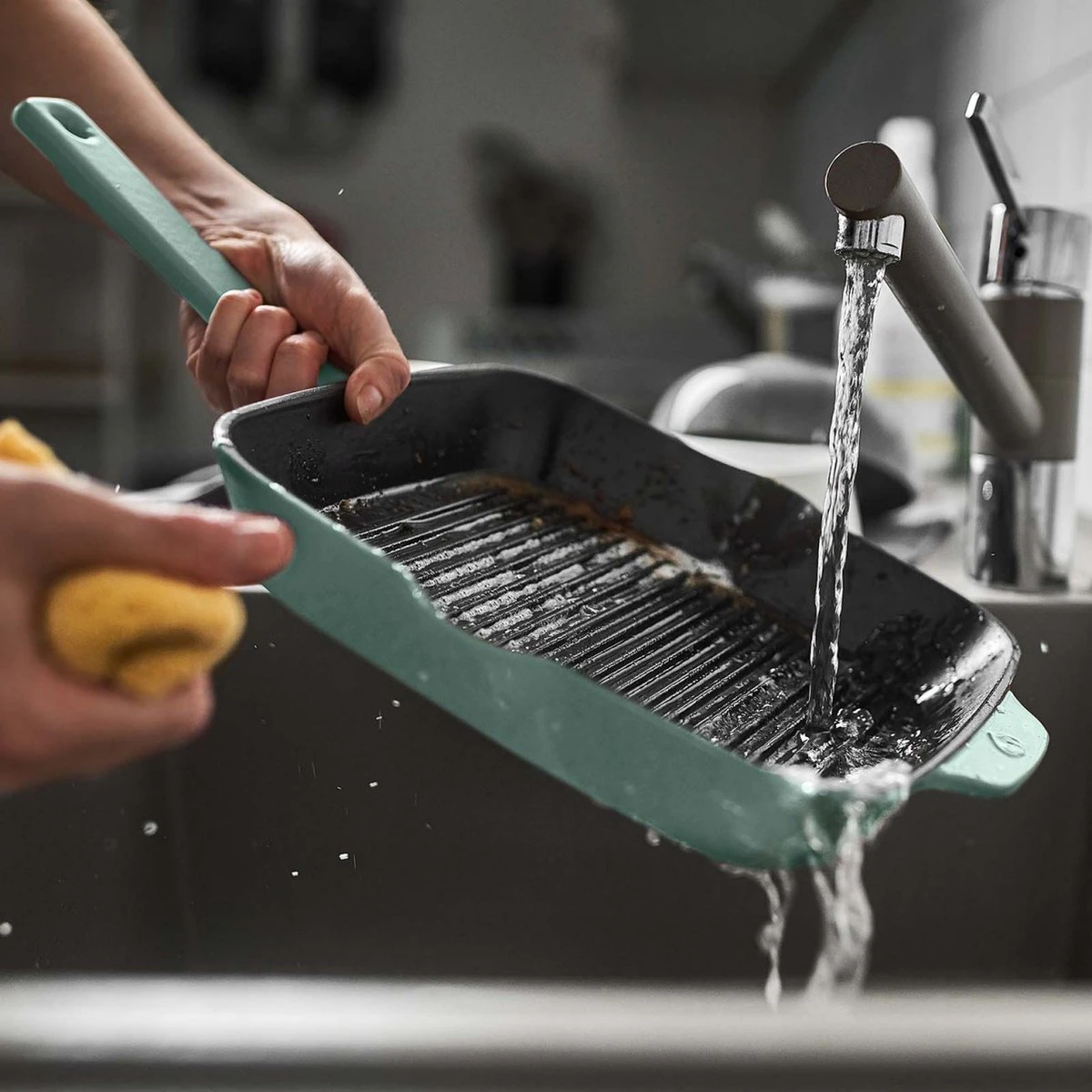 De mat glanzende emaillaag beschermt het gietijzer van je braadpan tegen krassen. Daarnaast kun je hem makkelijk met water, afwasmiddel en een zachte spons schoonmaken. Meer heb je niet nodig om je gietijzeren braadpan lang mee te laten gaan.