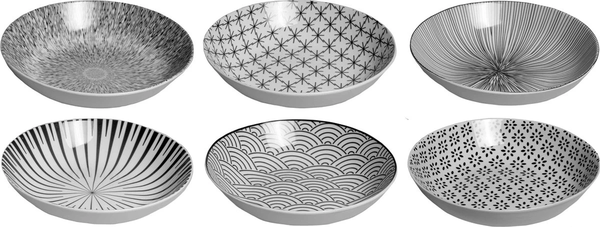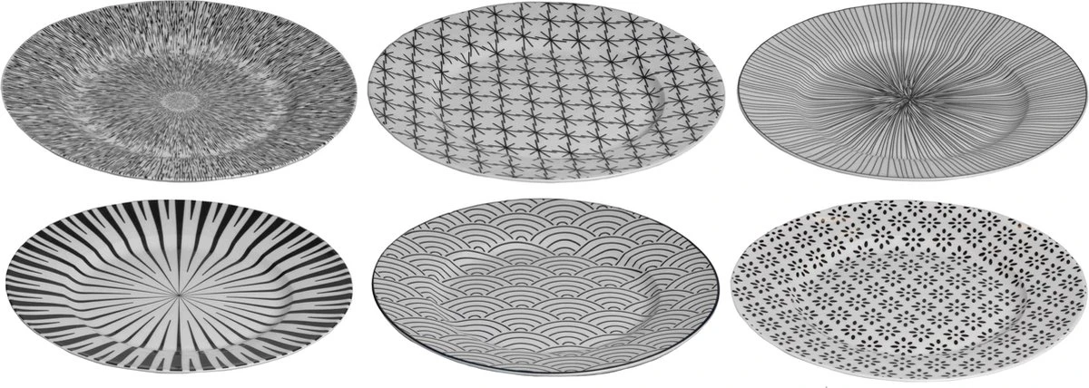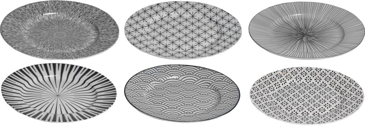 Studio Tavola Serviesset Black Sailor 18-DeligZet gezelligheid op tafel met deze Studio Tavola serviesset! De set bestaat uit verschillende borden met terugkerende prints. Deze prints zijn zorgvuldig uitgekozen waardoor het, ondanks de drukte, wel een geheel blijft. Let wel op: deze borden worden gemixt geleverd, er kan dus geen print gekozen worden. Combineer de borden met bijvoorbeeld de dinerborden, diepe borden of mokken van de Black Sailor collectie. Deze set bestaat uit: 6 dinerborden Ø 27 cm 6 ontbijtborden Ø 20.5 cm 6 diepe borden Ø 19.5 cm